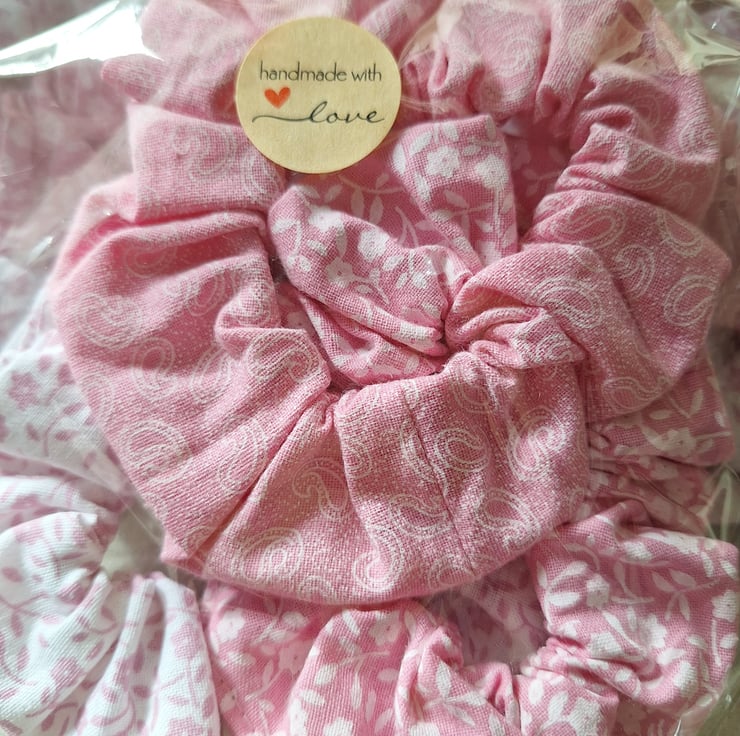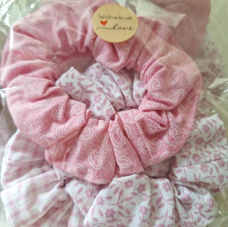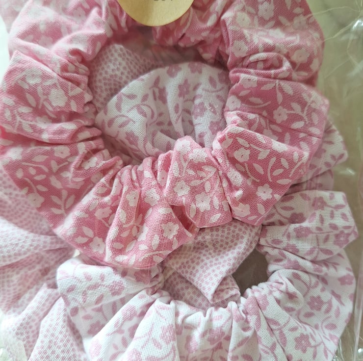 Pretty in Pink Collection, pack of three standard sized scrunchies, made using a mix of patterned and floral cotton fabrics in shades of pink and white.
