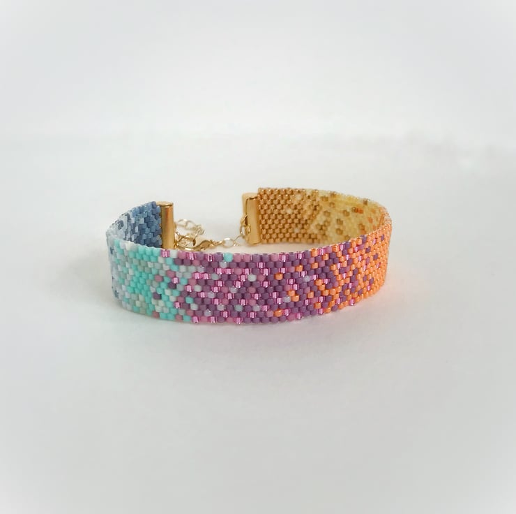 This unique bracelet was made using beautiful tiny Japanese glass beads called Miyuki Delica. There is a mix of matt, luster and gold beads and it beautifully catches the light when worn.