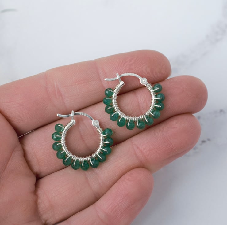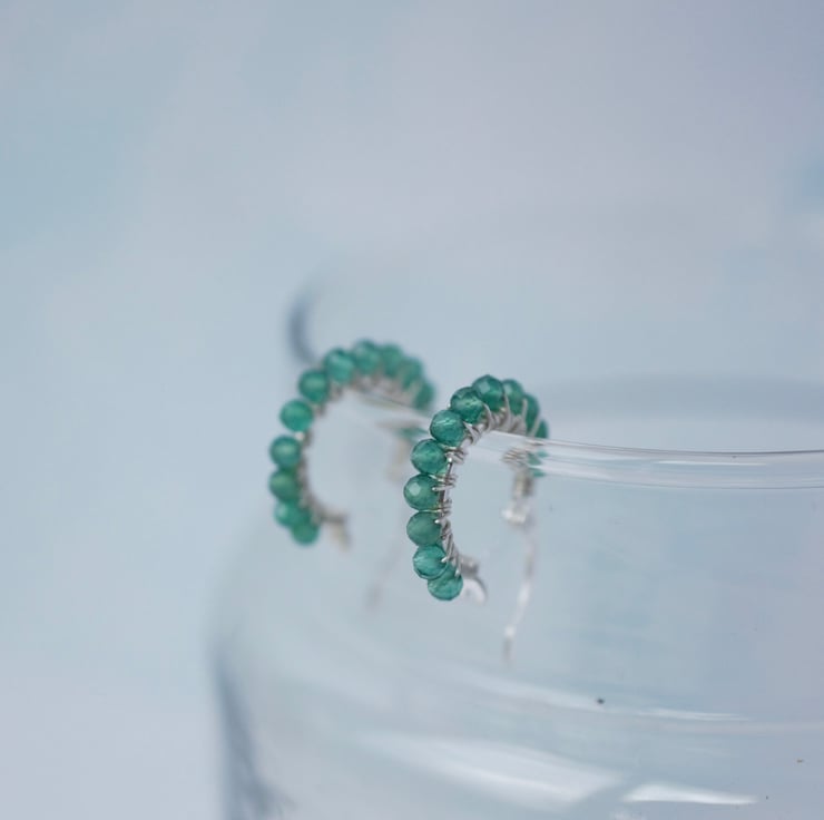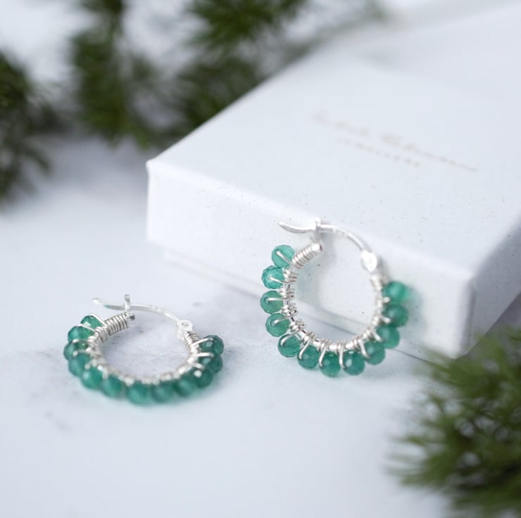 Designed and crafted by Isobel Robinson in her Yorkshire home studio, the earrings feature faceted green onyx gemstones thought to repel negativity and promote harmony. Each bead is hand selected and wrapped with silver wire around a sterling silver hoop.