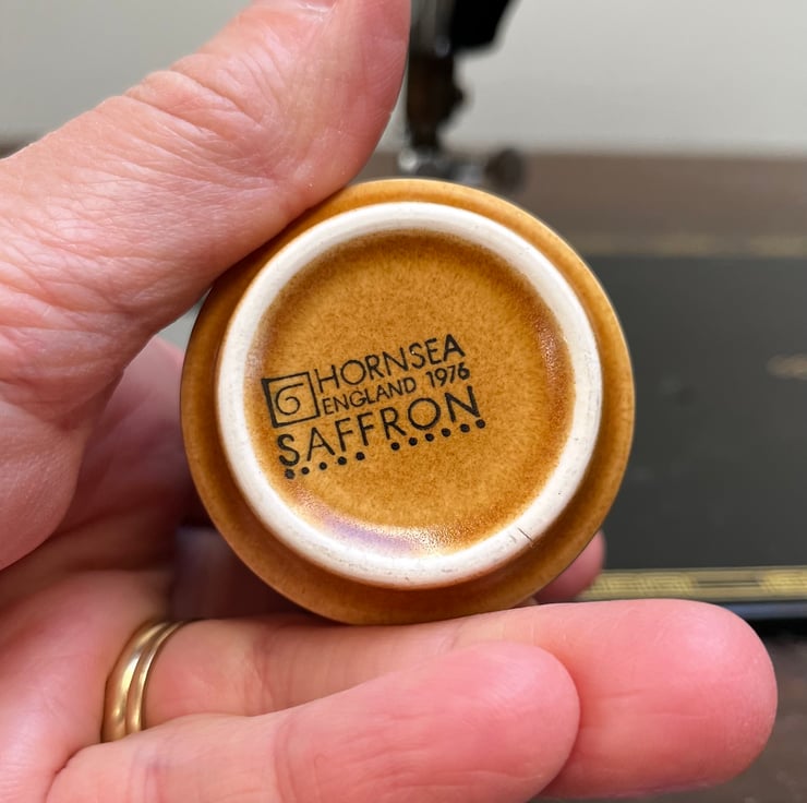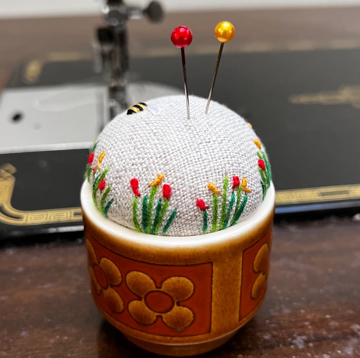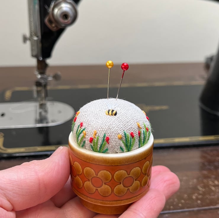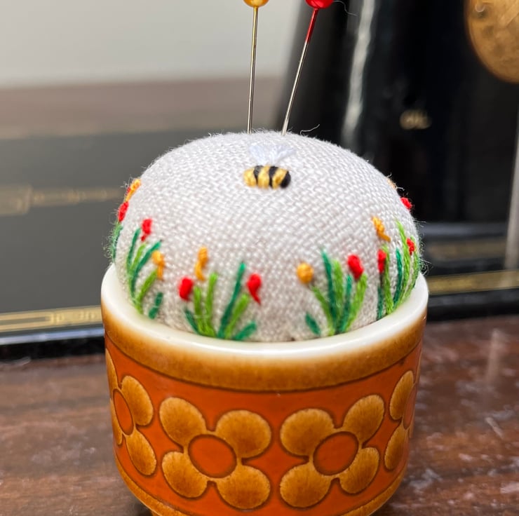 Pretty embroidered pincushion in a vintage Hornsea egg cup. The reclaimed linen cushion has been embroidered with tiny flowers and a bee.