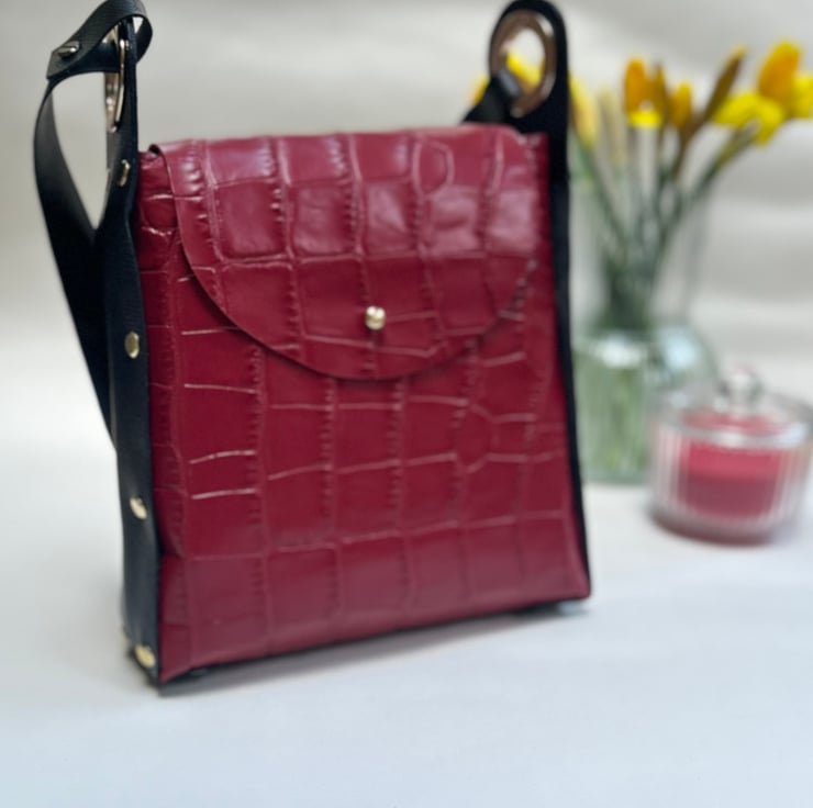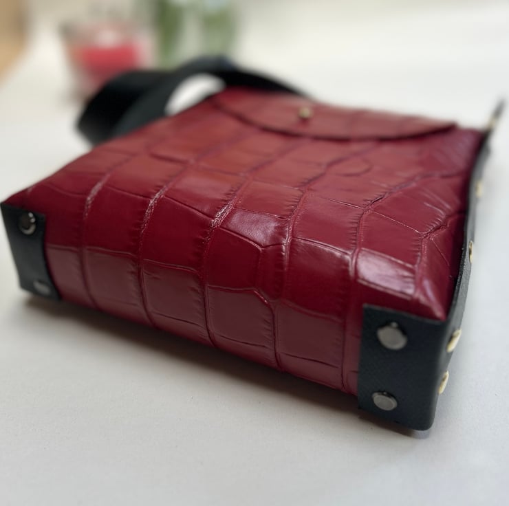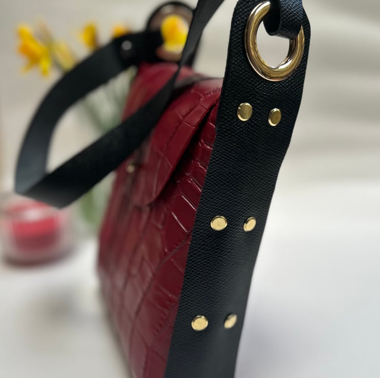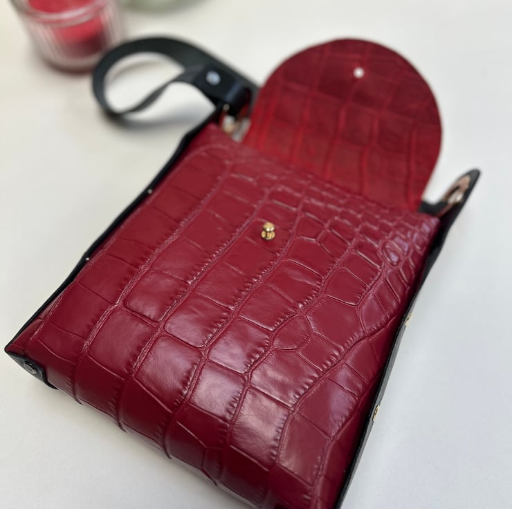 Mathilde is a chic, lightweight structured bag featuring beautifully rich glossy red croc embossed calf and fine hatch leathers with gold and gunmetal hardware to complete the luxe look, it can be hand held or worn over the shoulder.