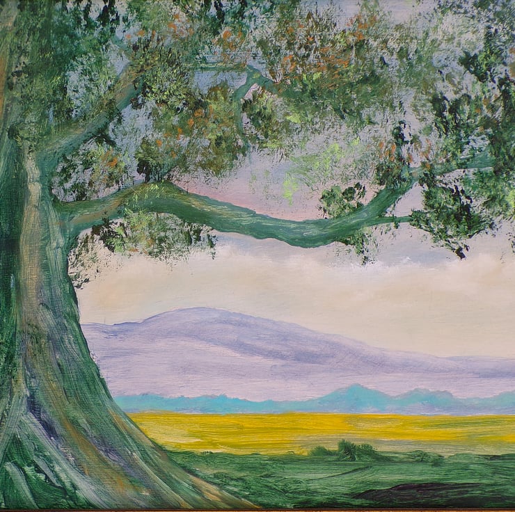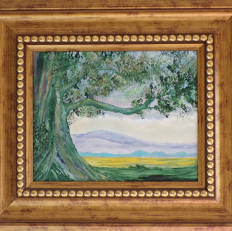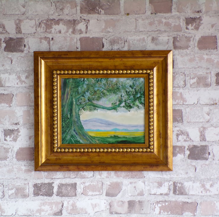 original signed semi impressionistic woodland/tree landscape oil painting in gold ornate frame, size 14"x 16" including frame, Titled The Oak King this is a lovely peaceful landscape with bright foliage a lone large oak tree looking over the fields and fluffy pink clouds, this would hang well with any type of home setting , this painting comes with a certificate of authenticity and is a one-off artwork,