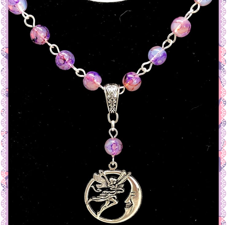 Fairy moon pendant with pretty 8 mm dragon vein glass beads, Tibetan silver connector, necklace measures approx 18” with an approx 2” pendant drop but can be adjusted to suit. Nickel free