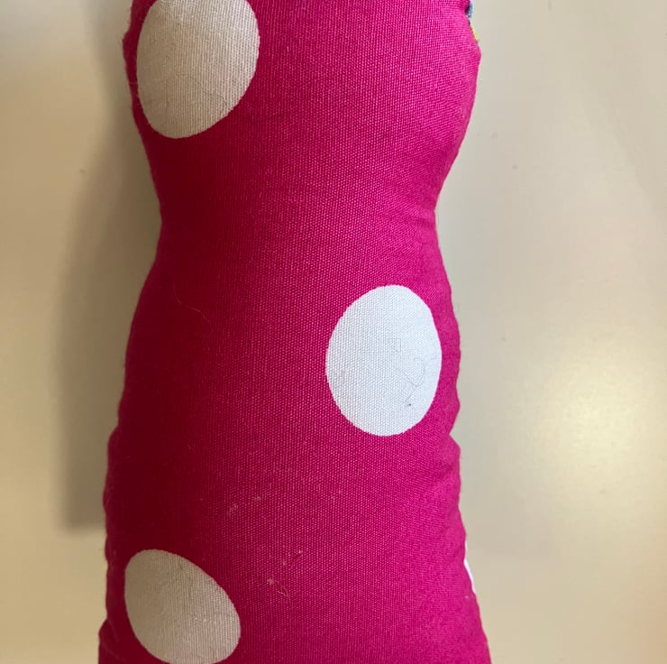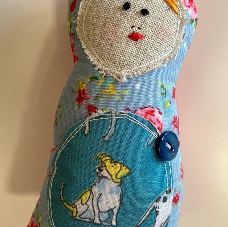 Hand embroidered face with bead eyes. A dog fabric piece on the tummy and a blue vintage button. The back has pink with white spot fabric. Hang anywhere around your home from the twine loop. Approximately 20cm tall and 8cm wide. Stuffed with toy filling.