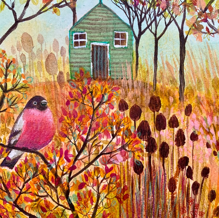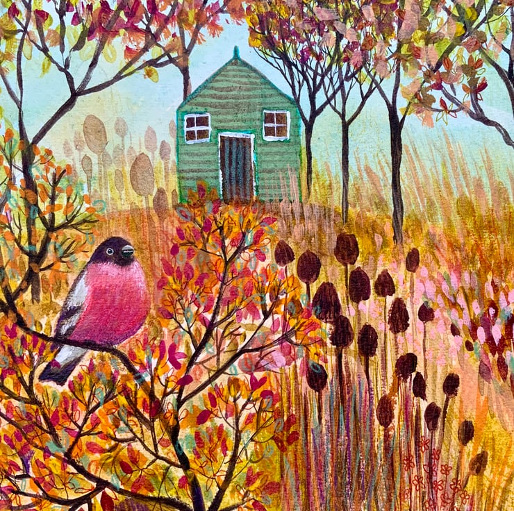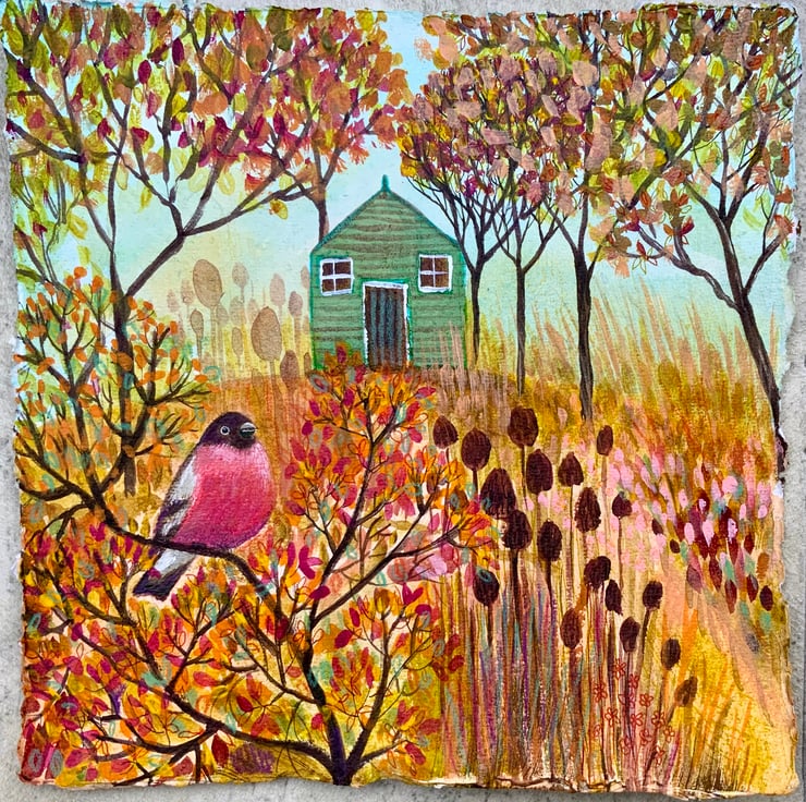 This is an acrylic painting, painted on Indian Khadi watercolour paper. It measures approximately 20x20 cm and comes unmounted and unframed allowing you to choose a frame to your own style. It is a landscape painting on a beautiful Autumn day and is inspired by the birds that visit my garden. We don’t often get bullfinches so it’s a treat to see one when they do visit our garden.