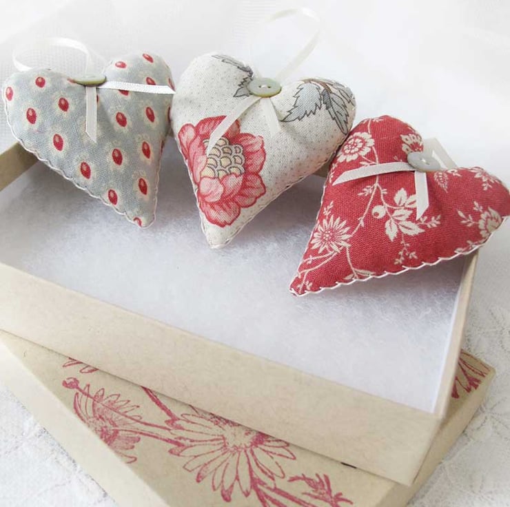 They will be carefully packaged in a hand decorated box. The listing is for three lavender hearts and you will receive the actual ones in the photograph. I have also shown examples of the box they will be sent in.