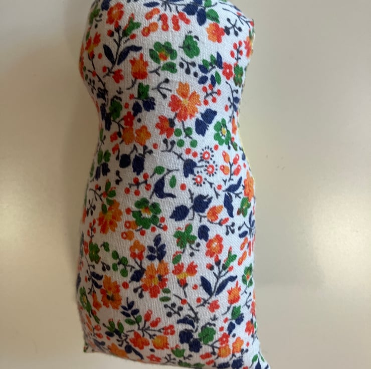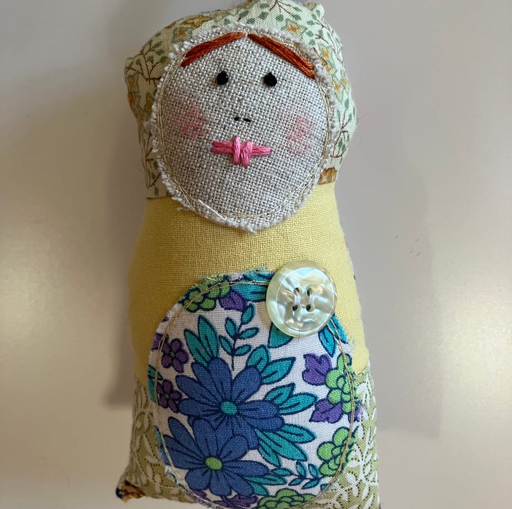 Hand embroidered face with bead eyes.A vintage flower tummy and a vintage button. The back has flowery fabric. Hang anywhere around your home from the twine loop. Approximately 20cm tall and 8cm wide. Stuffed with toy filling.
