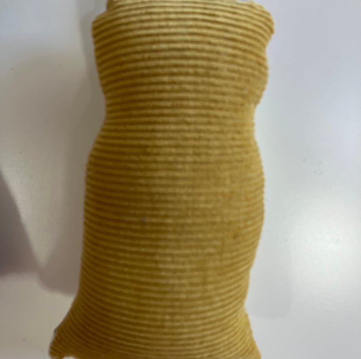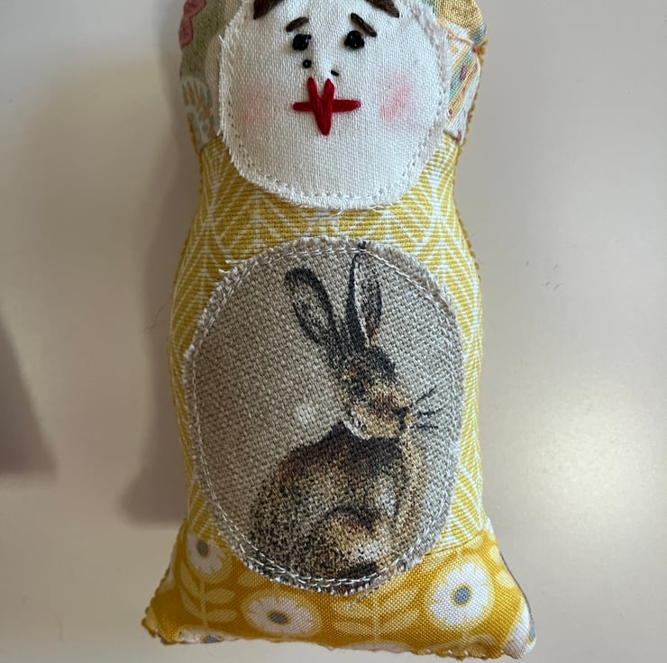 Hand embroidered face with bead eyes. A hare on the tummy, with yellow patterned fabrics. The back has corduroy fabric. Hang anywhere around your home from the twine loop. Approximately 20cm tall and 8cm wide. Stuffed with toy filling.