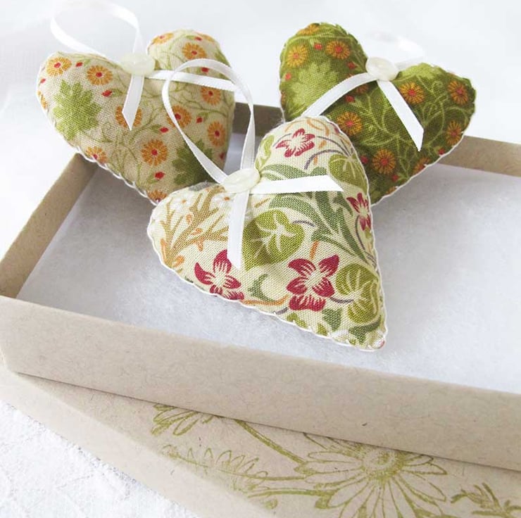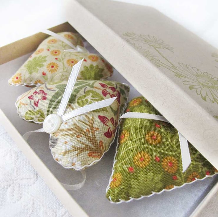 They will be carefully packaged in a hand decorated box. The listing is for three lavender hearts and you will receive the actual ones in the photograph. I have also shown examples of the box they will be sent in.