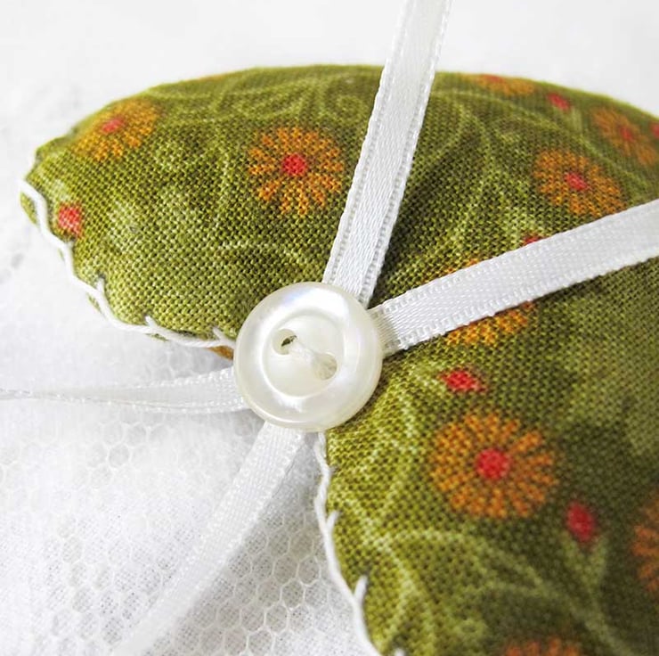 A very pretty little set of three lavender bags - hand made, filled with beautiful scented lavender and then finished with hand embroidery, satin ribbon and little pearlised shell buttons. They are made in co-ordinating fabrics in beige, olive green, golden yellow and brugundy, and they measure 6cm wide x 6.5cm long (not including the ribbon).