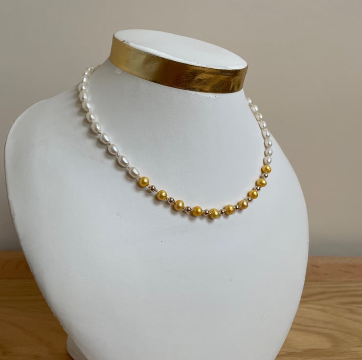 This elegant, with a touch of “fun”, pearl necklace is made with a mixture of approx 6mm rice and potato shapes pearls and has been manually hand knotted with silk thread using only a pair of tweezers as a tool.