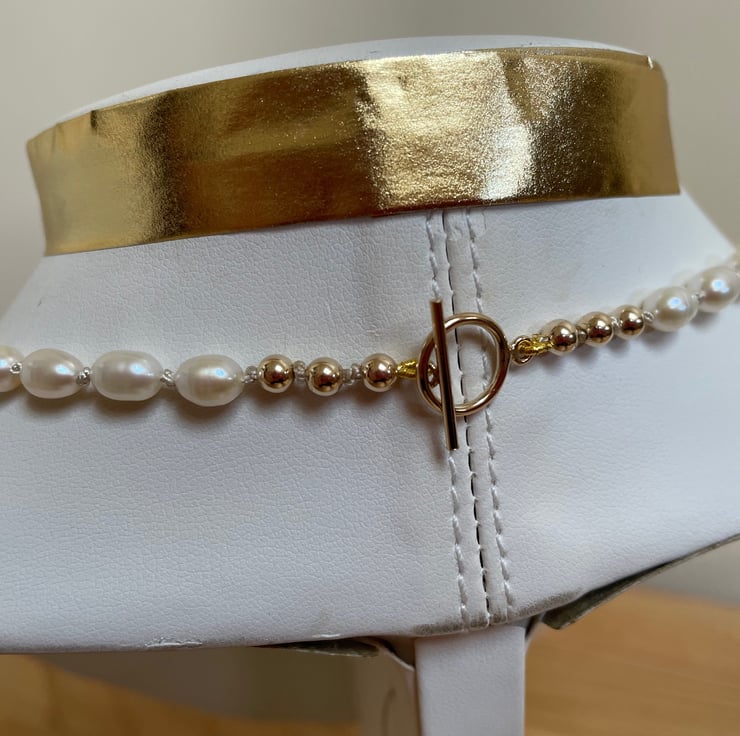 This necklace is made with a toggle clasp which make it easy to put on and take off even if you have nobody is around to help you. I always add three small beads either side of the clasp as I find that it helps me holding the necklace. Metal beads and clasp are 14K Gold filled giving longer lifespan than plated gold.