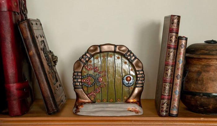 This little door shelf ornament was handmade by me using polymer and air dry clay and then painted using acrylics. There are some gilding flakes sprinkled on the steps to give effect of fallen leaves.