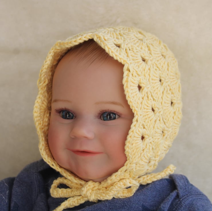 Crocheted using a bamboo and cotton mix yarn ensuring the bonnet is soft and smooth against delicate skin. The soft yellow colour is compliments the spring and summer colours.