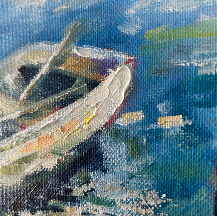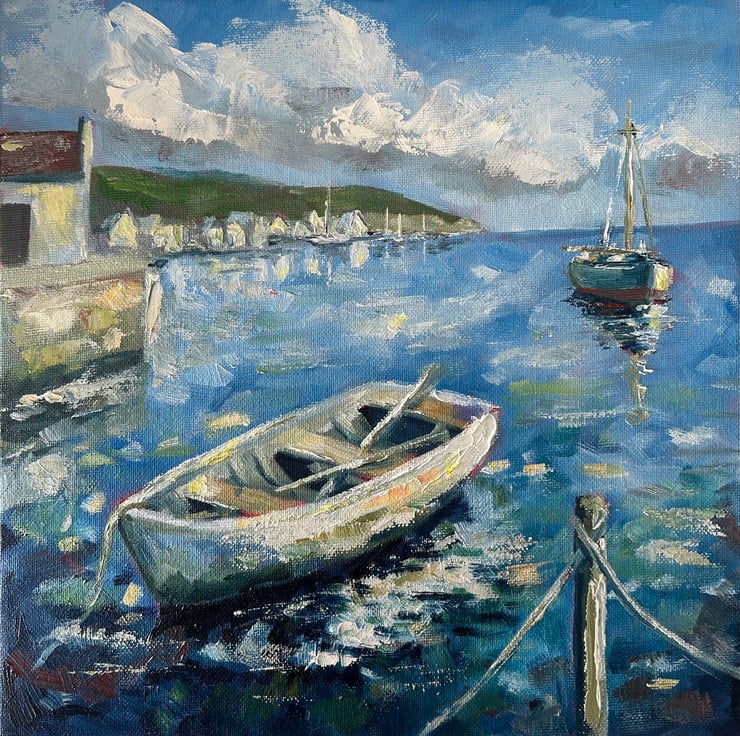 A loose, lively painting of a small rowing boat in a Harbour. This is on stretched canvas with painted edges. 30cm x 30cm.