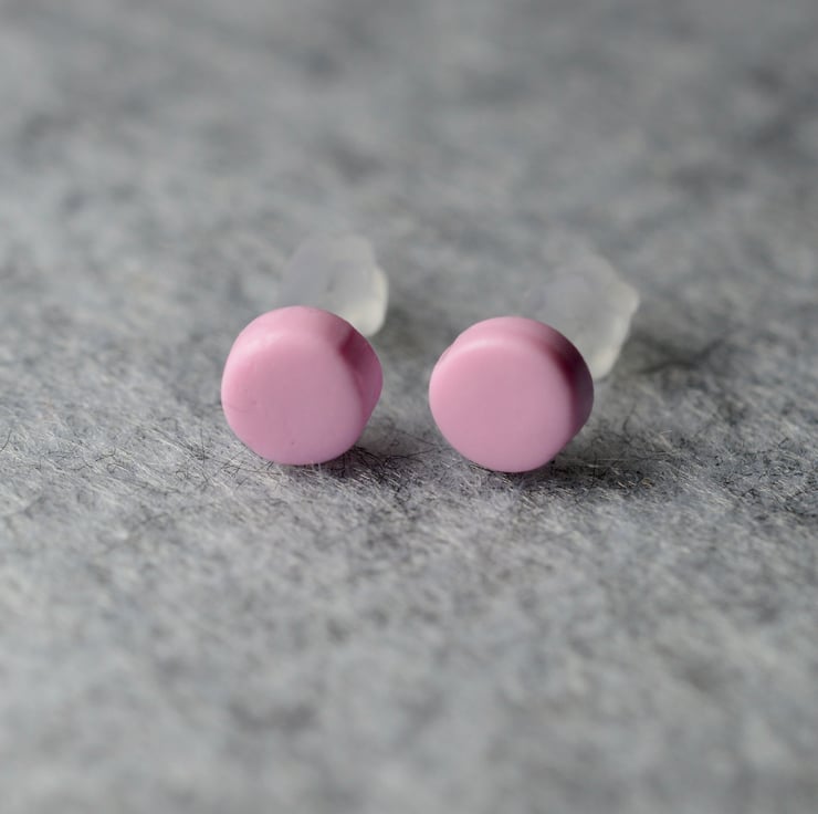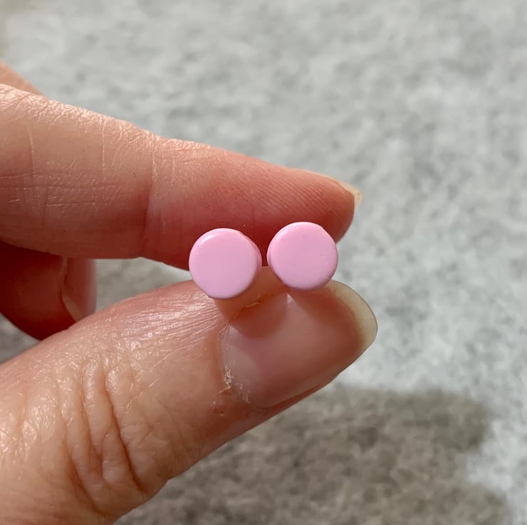 A pair of small earrings made from polymer clay, and on plastic posts.