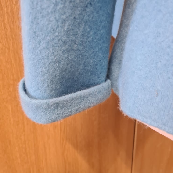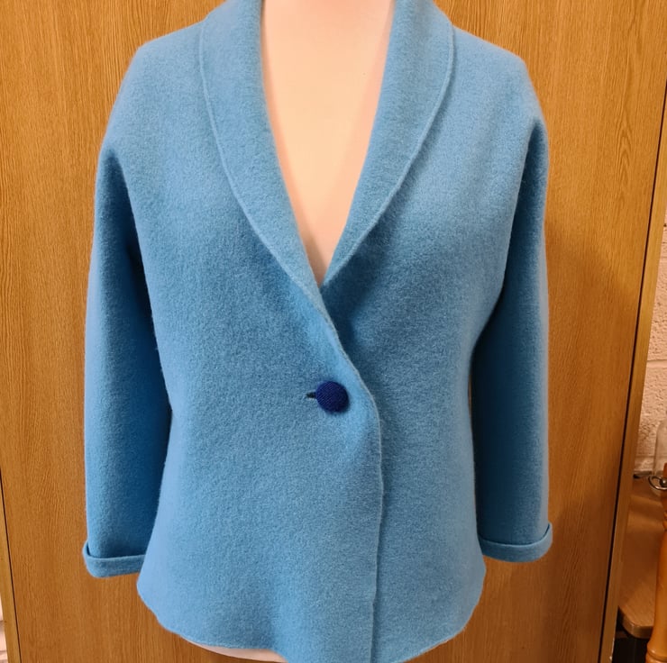 A stunning fitted jacket with shawl collar and turn up cuffs. Size large (16-18). With contrast button fastening