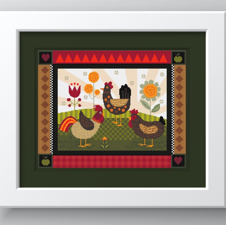 Americana Primitive Folk Art Farm Hens and Flowers - Chickens kitchen country cross stitch/tapestry chart by Vivienne Powers - 185