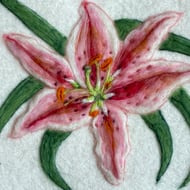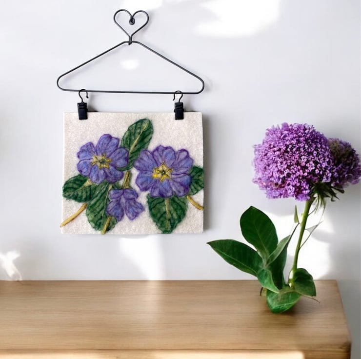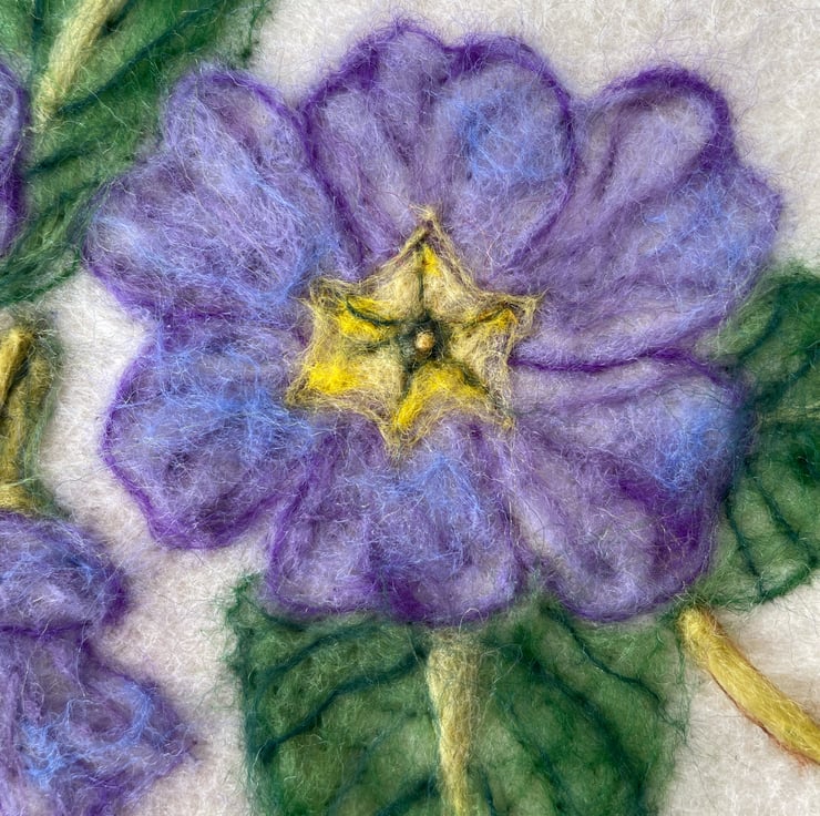 A primroses is such a pretty flower, with so many colours & patterns in the structure of the plant. I particularly like this lilac slightly blue variety. The various marks and patterns I find inspiring to re create as a felted piece. I particularly enjoy blending different coloured wools and tones of colour. This piece would look so lovely on a wall adding a feature piece to any living space.