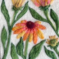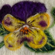 This unique textile piece captures the joyful energy of spring with primroses created using the needle felting technique. The flowers are ‘painted’ with wool, felted onto a soft natural base and detailed is added to bring out their movement and colour.