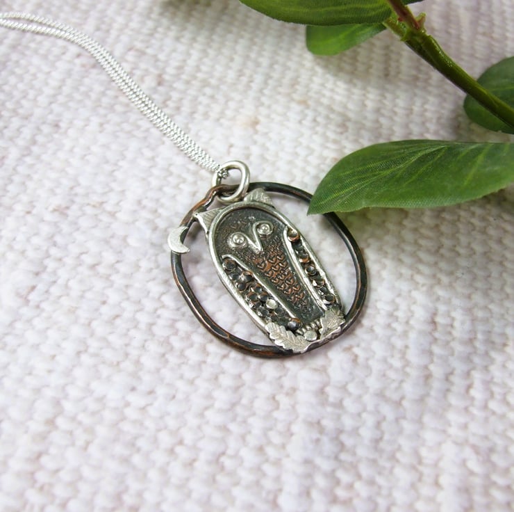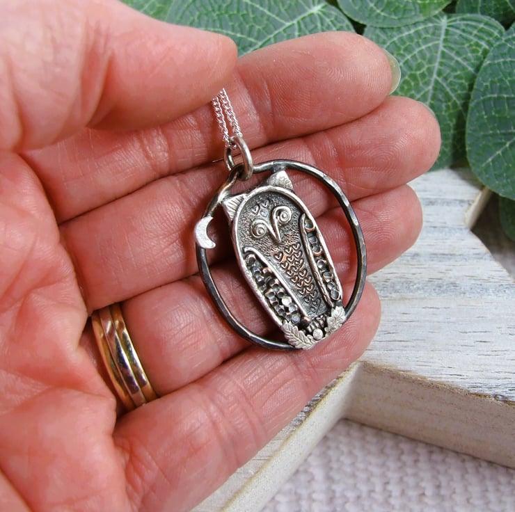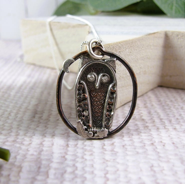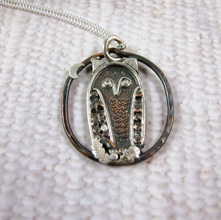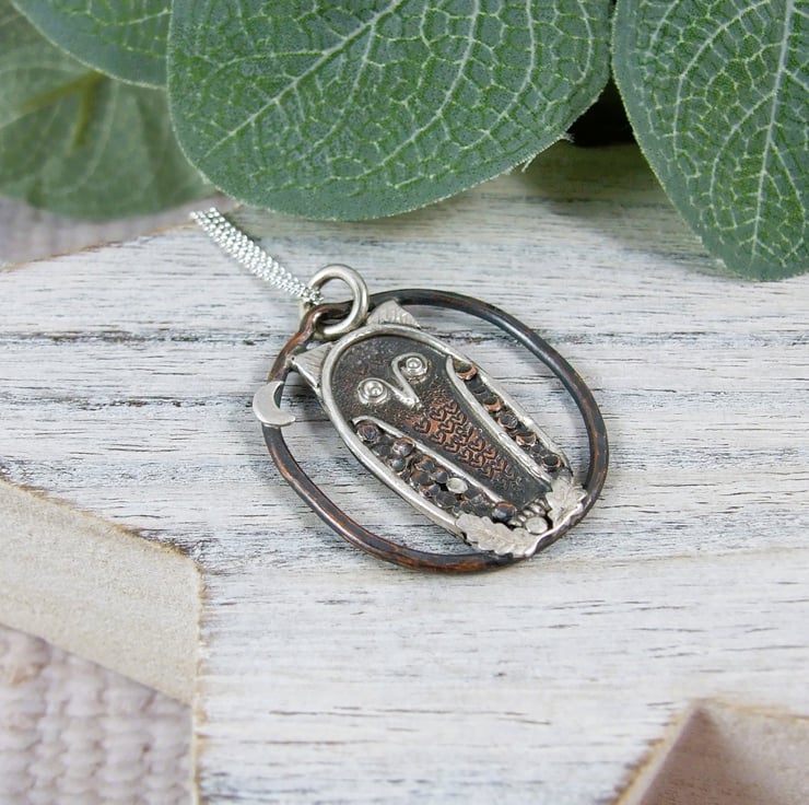 The owl is nestled inside a copper ring with a tiny silver moon and leaves for added contrast. Suspended from an 18 inch sterling silver chain.