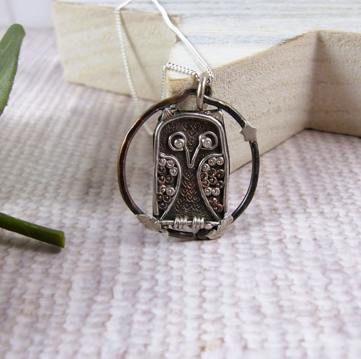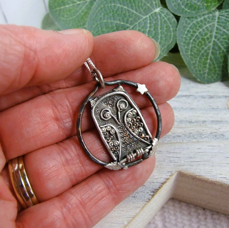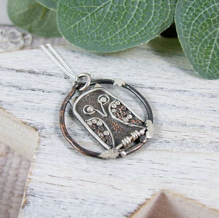 The owl is nestled inside a copper ring with a tiny silver star and leaves for added contrast. Suspended from an 22 inch sterling silver chain.