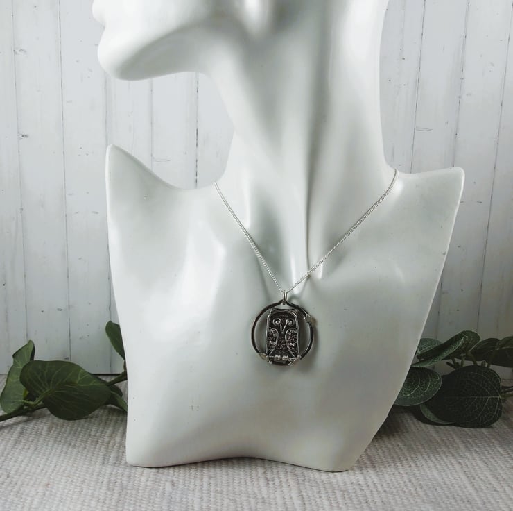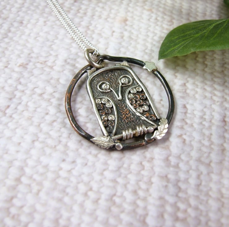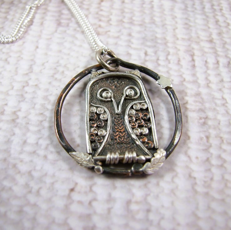 Sterling Silver and Copper Owl Pendant. Sustainable silver and copper one of a kind necklace on longer 22 inch silver chain.