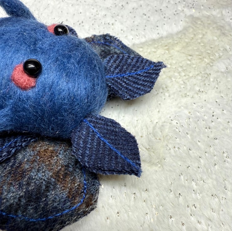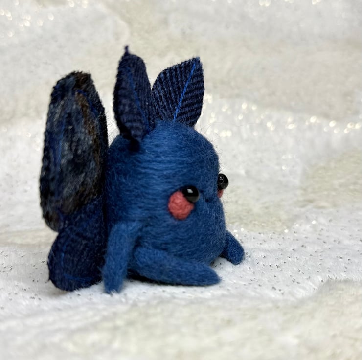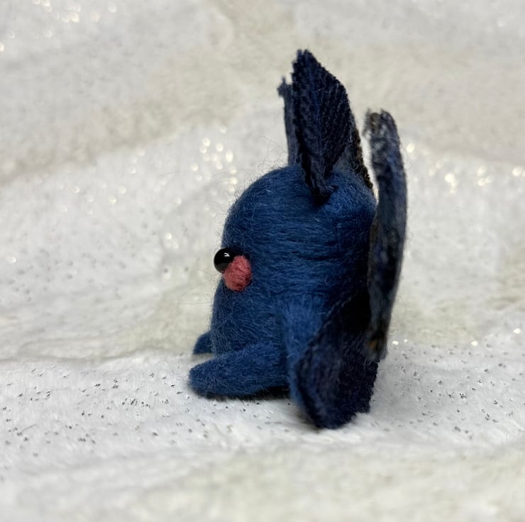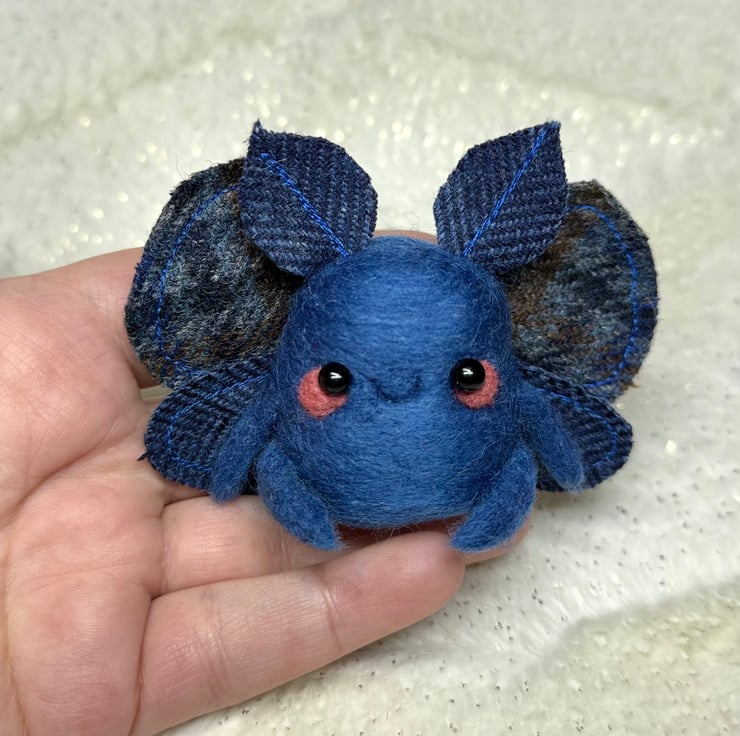 This little blue friend can sit unaided on a shelf and lovingly watch on. Made from needlefelted wool and measuring roughly 7cm tall, this friend has glass bead eyes and chubby cheeks. Moth has hand cut tweed antenna and wings sewn into place There are two patterns of complimentary tweed used. This is for decorative purposes only and not a toy. Sent in recycled or recyclable packaging. If you require tracking please also add the tracking option to your cart.