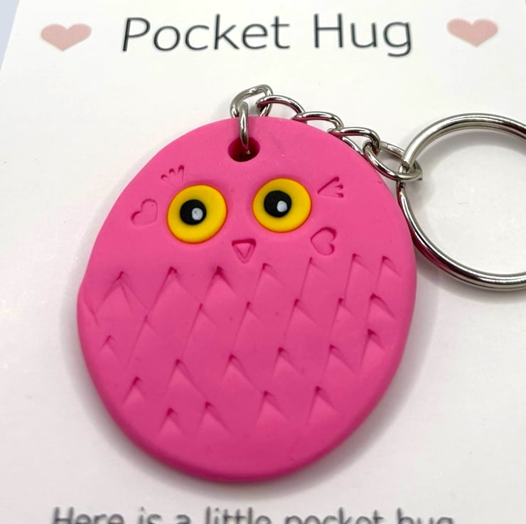 This adorable little pink owl is handcrafted from polymer clay and features my original design. It comes with a chain and a sturdy split ring, making it perfect for use as a keychain or bag charm. It would make a lovely gift for a loved one, friend, or anyone you want to let know you're thinking of them.