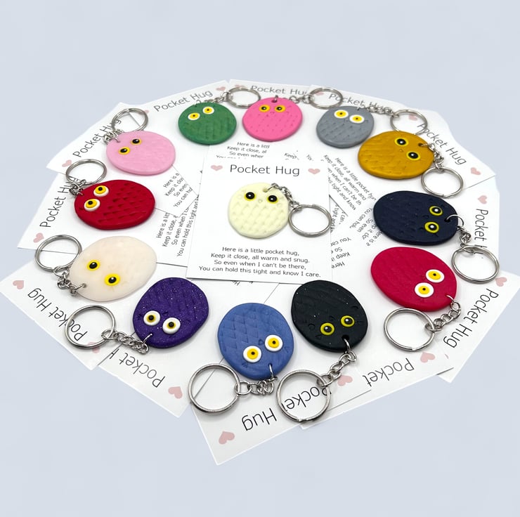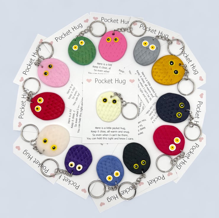 The owl is attached to a card that reads "Pocket Hug" at the top, accompanied by a poem below. It can be easily removed from the card, and the glue dot can be peeled off easily. Since each owl is made by hand, no two will be exactly alike, but they will all be irresistibly cute.