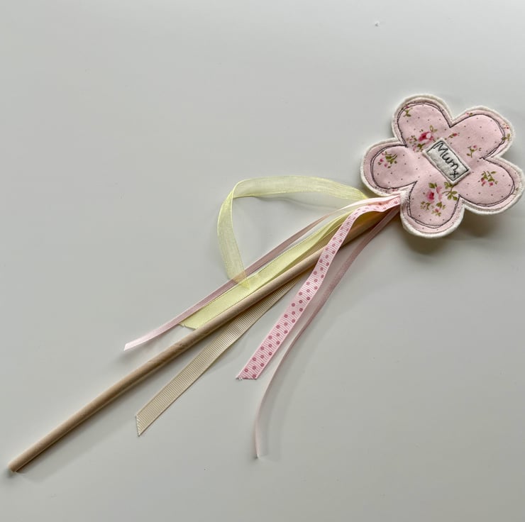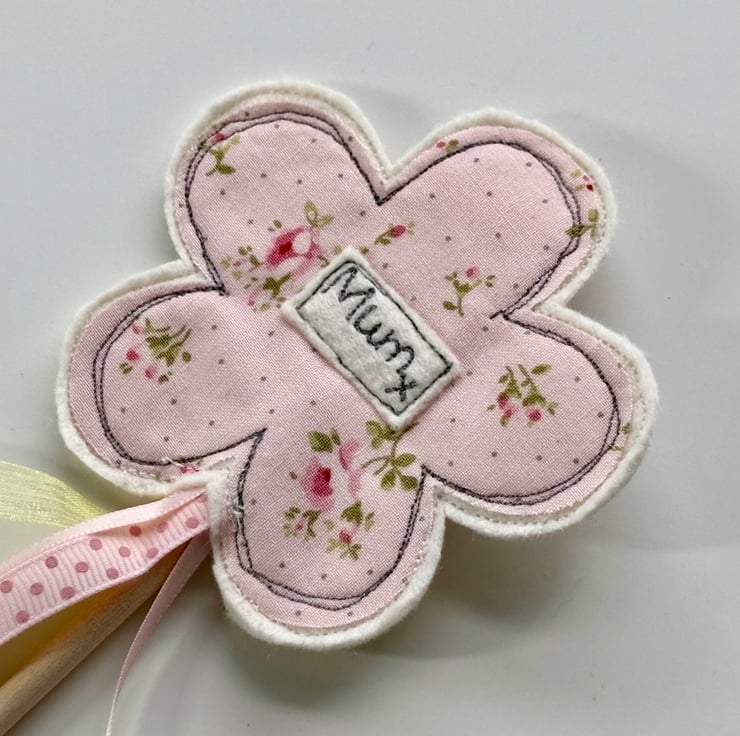 A sweet felt fabric flower on a stick with a freehand machine embroidered word 'mum x' in the centre. The edge of the flower is also highlighted in freehand machine stitches and the piece is trimmed with pretty, complimenting pastel ribbons. The fabric is a pastel pink with a delicate print pink flower and is backed onto cream felt.