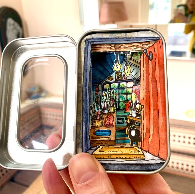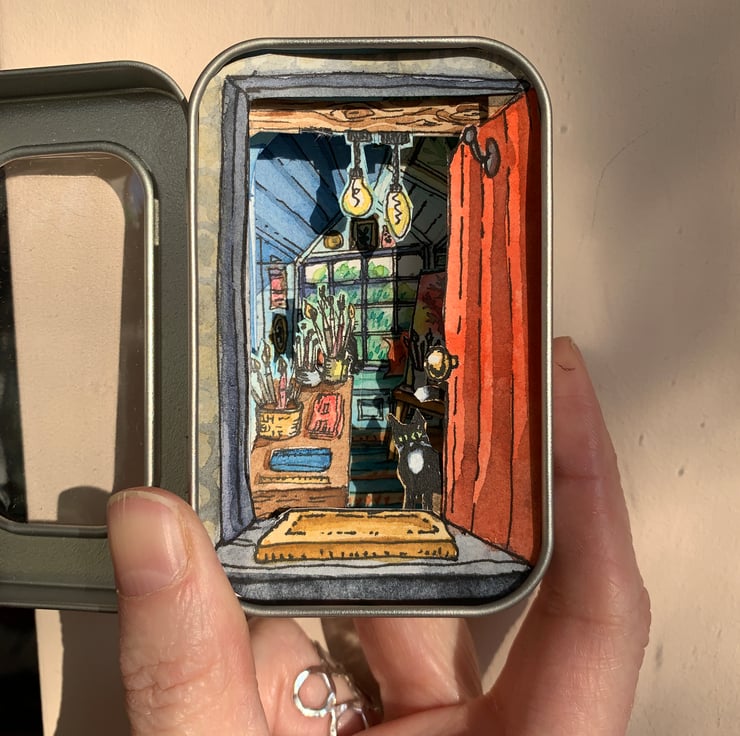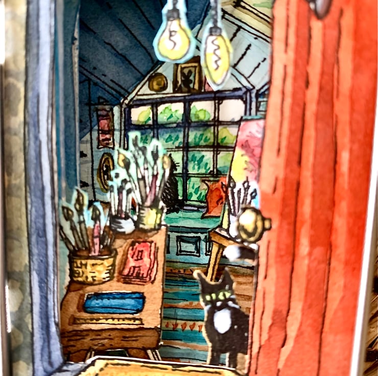 Constructed with 4 layers of watercolour paper into a 3D illustrated scene depicting an enticing view into a busy artist’s studio with art supplies, easel, quirky interior and two cats. Size 9cm x 6cm.