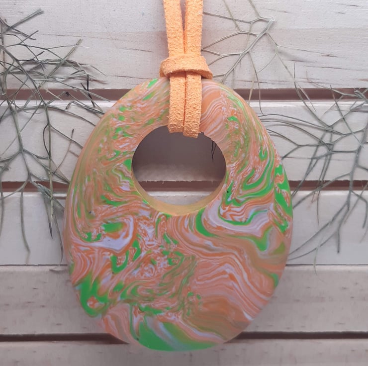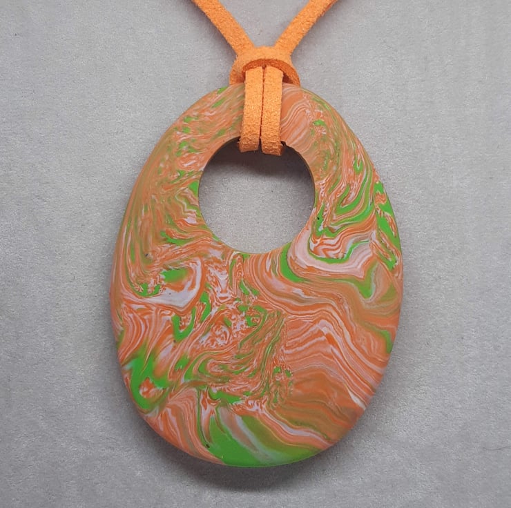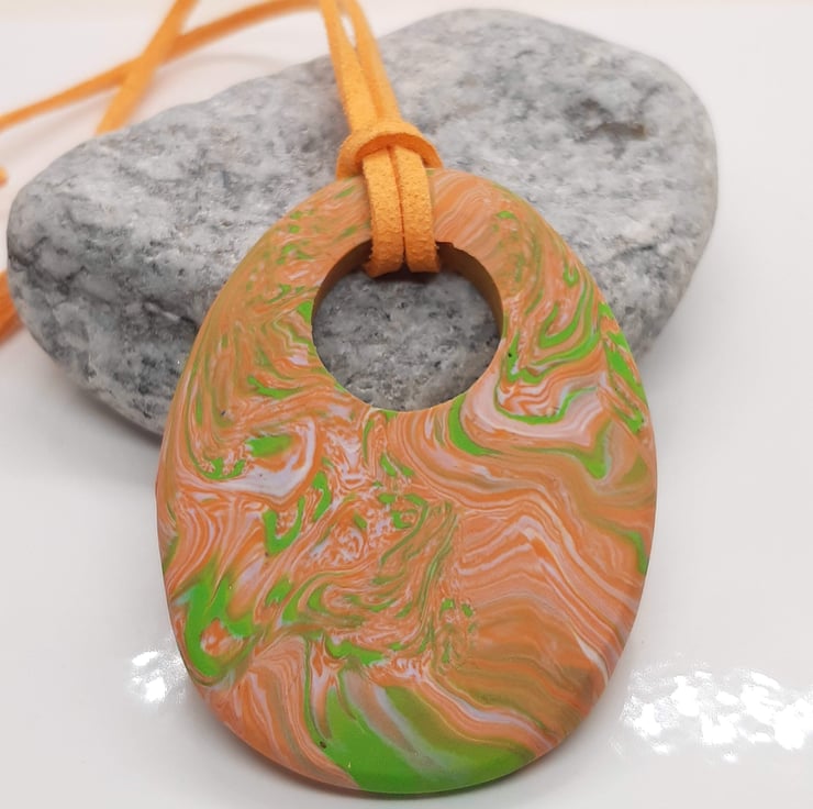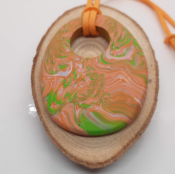 A handmade pendant made from a blend of orange, lime green and white polymer clay in a unique swirl design to create a circular pendant.