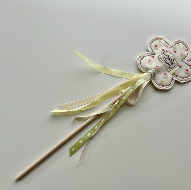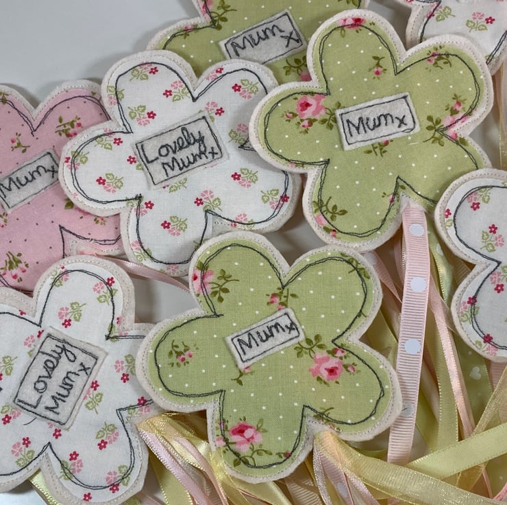 A sweet felt fabric flower on a stick with a freehand machine embroidered word 'Lovely Mum x' in the centre. The edge of the flower is also highlighted in freehand machine stitches and the piece is trimmed with pretty, complimenting pastel ribbons. The fabric is cream with a delicate printed sprig flower and is backed onto cream felt.