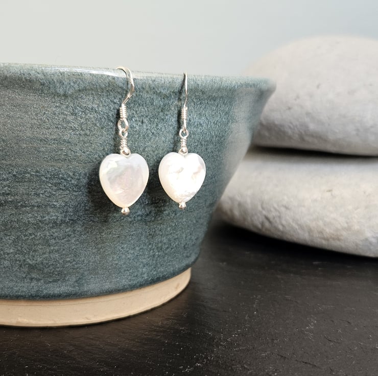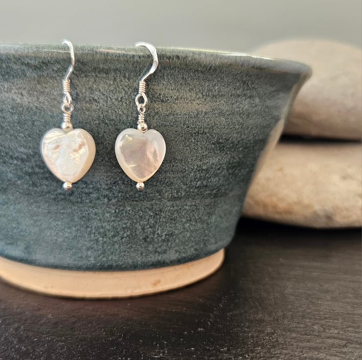 These pretty earrings are made with 14mm mother of pearl hearts and sterling silver beads and hooks.The simple, yet elegant design are perfect for everyday, holidays, or even weddings!