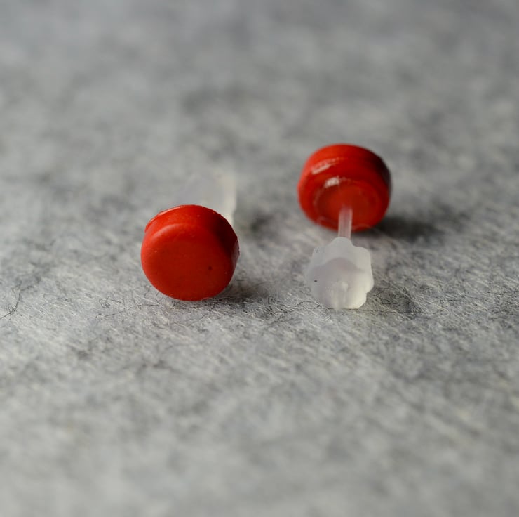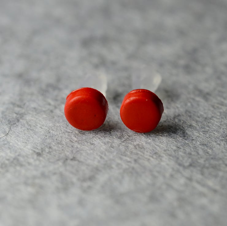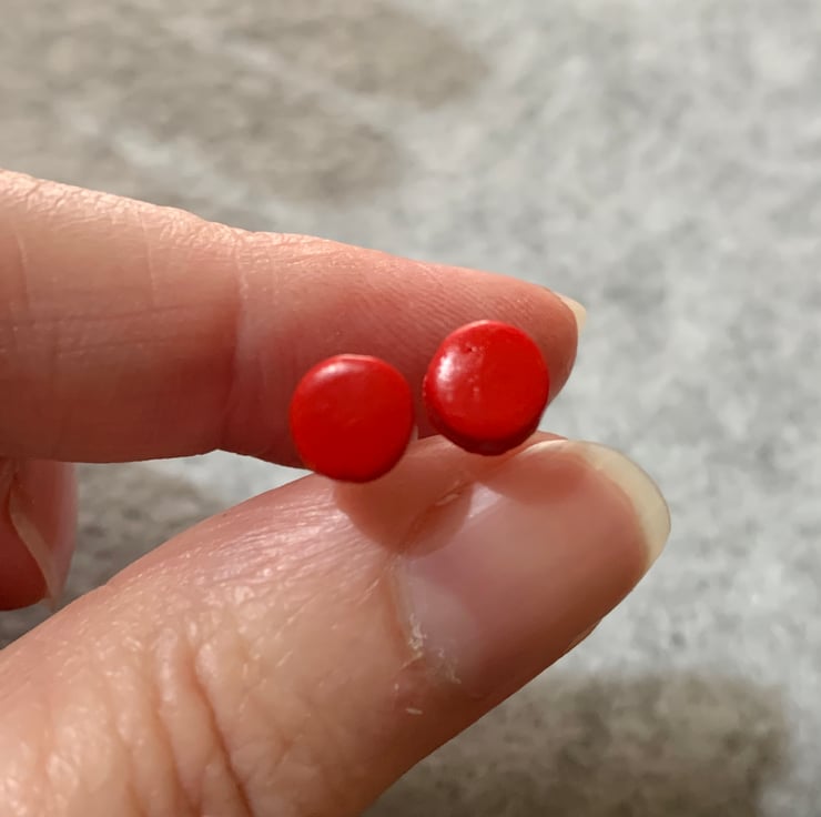 A pair of small earrings made from polymer clay, and on plastic posts.
