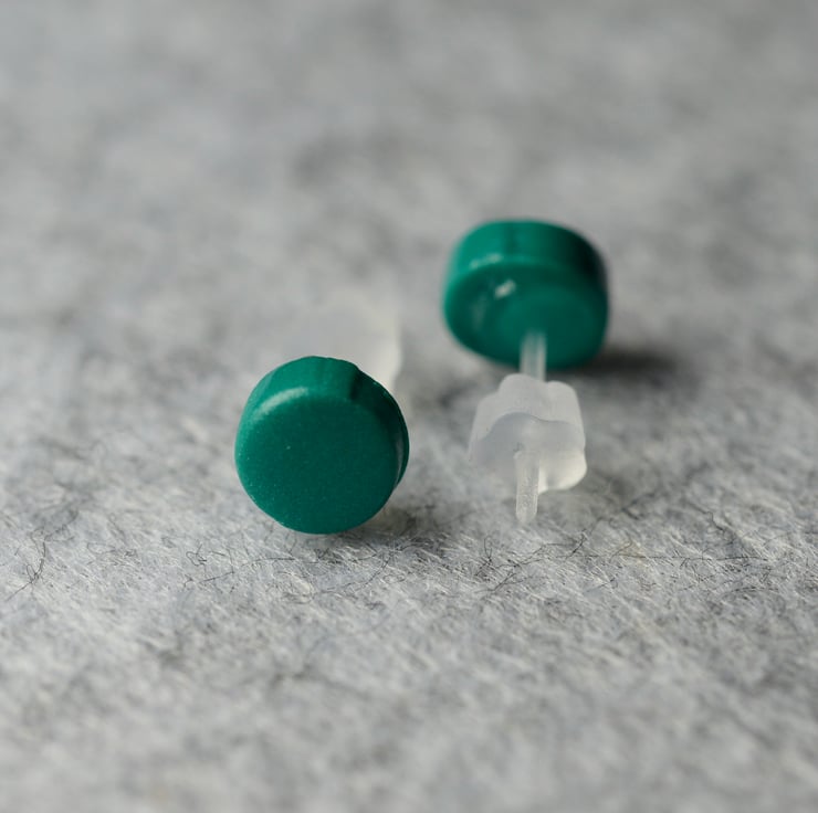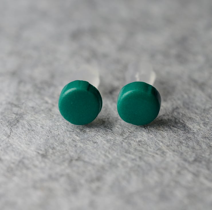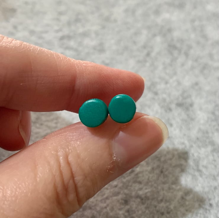 A pair of small earrings made from polymer clay, and on plastic posts.