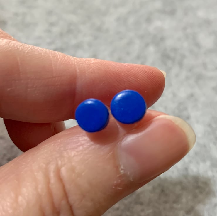 A pair of small earrings made from polymer clay, and on plastic posts.
