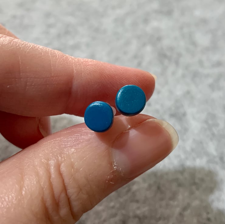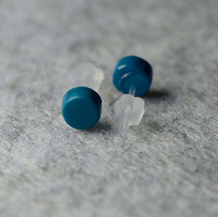 A pair of small earrings made from polymer clay, and on plastic posts.