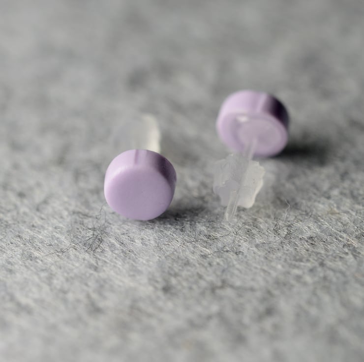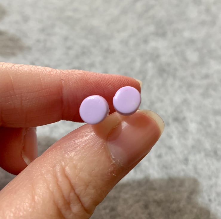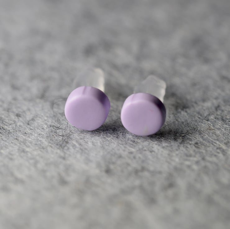A pair of small earrings made from polymer clay, and on plastic posts.