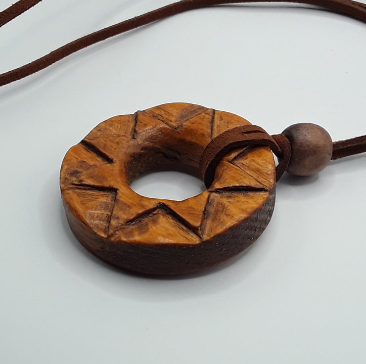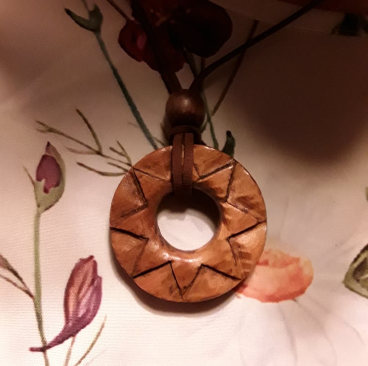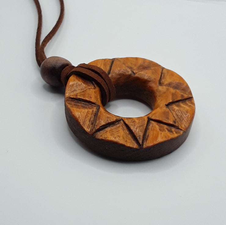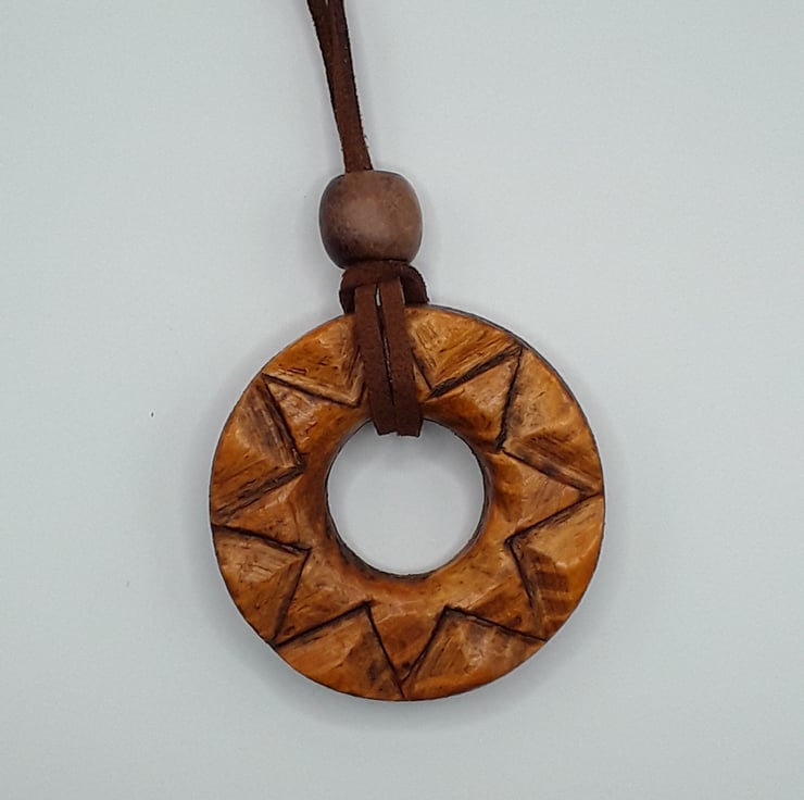 A hand carved Sun Necklace, made in a Rustic style, a proper Hippy style Necklace great for informal summer wear, wear it on its own or with other necklaces, made from recycled wood. I provide enough cord to tie to the length you require.