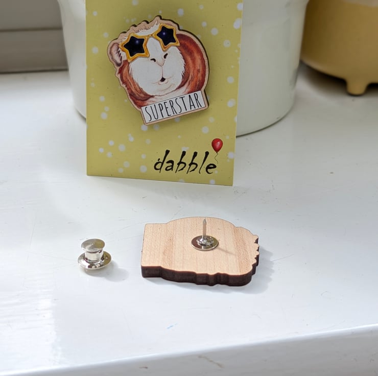 Are all guinea pig owner's happy? I think so. So here's a happy little superstar guinea pig wooden pin badge. A cute guinea pig gift for any superstar in your life - friends, family, loved ones and especially yourself! Pin your lapel badge to your collar, jacket pocket or lanyard, the steel pin on the back will secure it there.