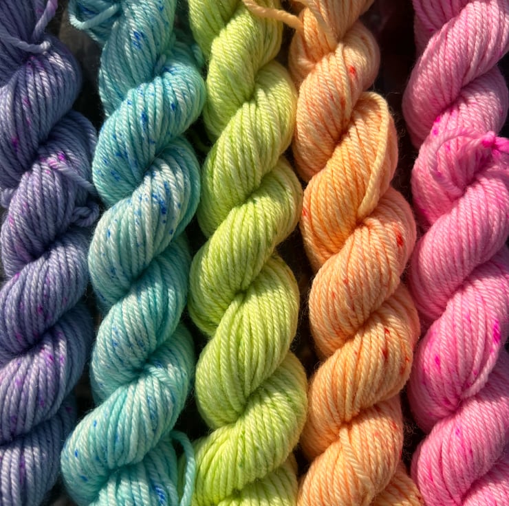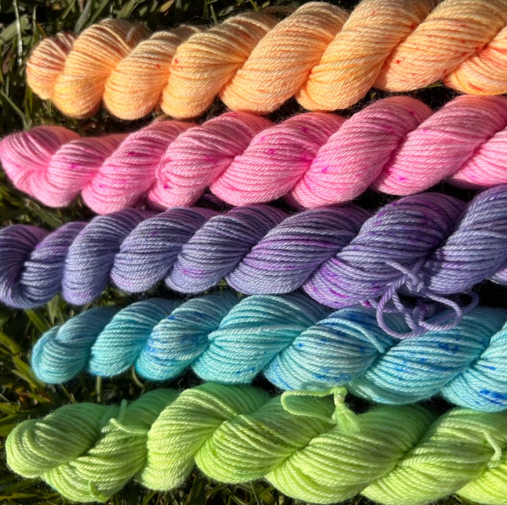 Here we have 5 pack of Easter Egg colourway Minis. I have done these on DK base and 4 ply sock base (see separate listing for other bases). Both are the following content: