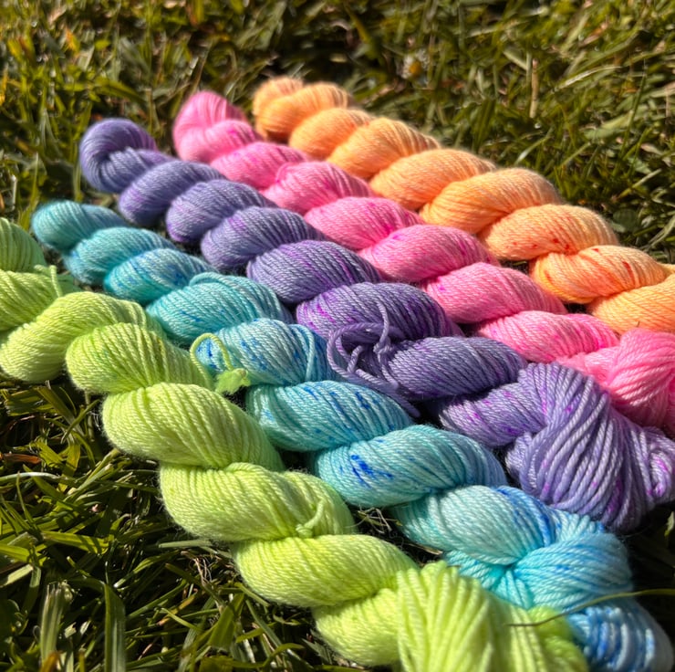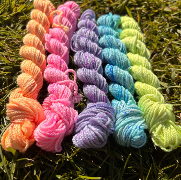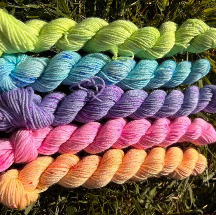 Here we have 5 pack of Easter Egg colourway Minis. I have done these on 4 Ply base and DK base (see separate listing for other bases). Both are the following content: