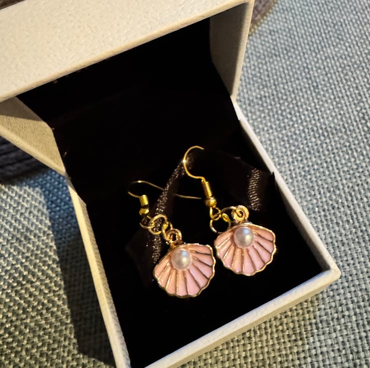 Seashell-shaped pendants with soft pink and gold accents, beautifully mimicking the natural ridges of a real shell.