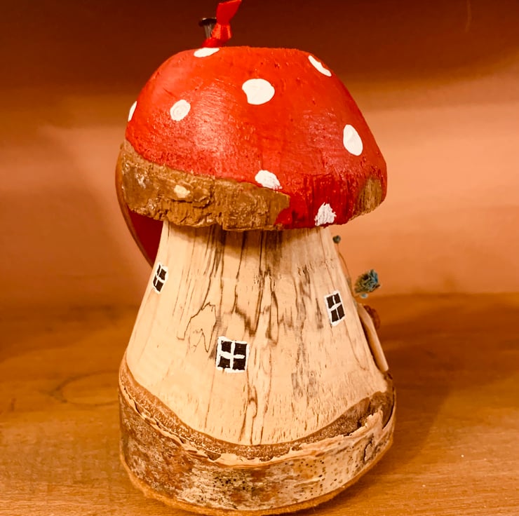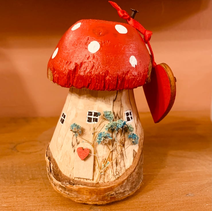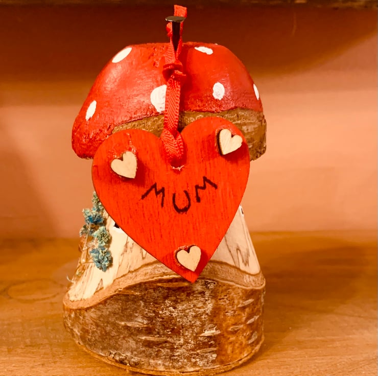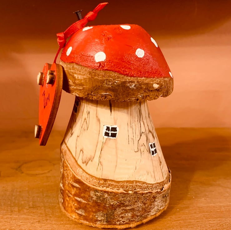 A hand turned toadstool house with a ‘mum’ heart hanging from the chimney, and flowers around the front door. The base is felt covered to protect furniture.