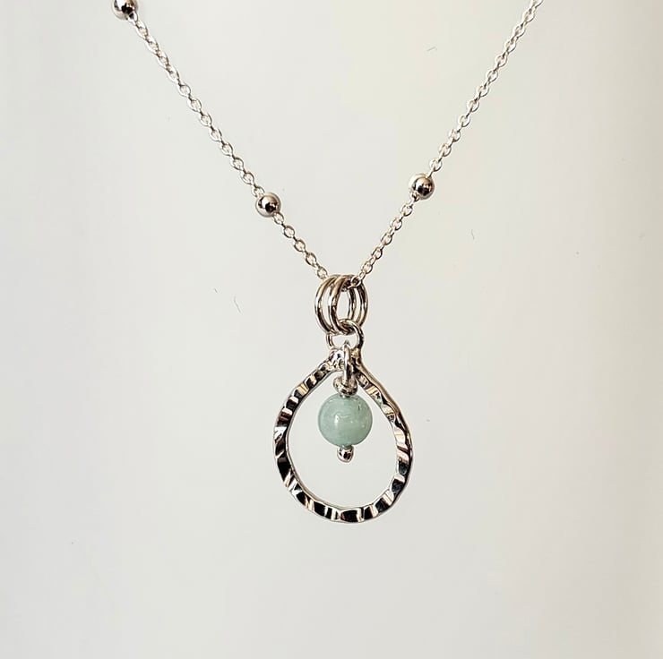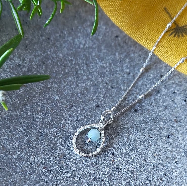 This sterling silver hammered teardrop pendant is beautiful in its simplicity, the pastel green-blue Amazonite natural gemstone is a stone of peace, truth, harmony, and communication, it hangs loosely in the centre of the teardrop. I make each piece individually and the natural bark effect texture is added by using a riveting hammer, making every one unique and when polished these really do sparkle as they catch the light.