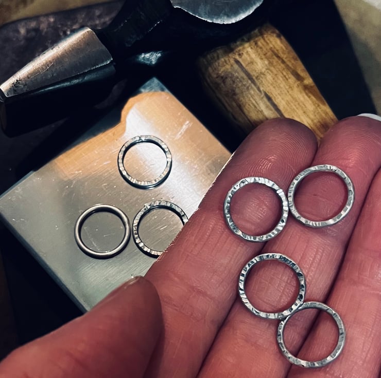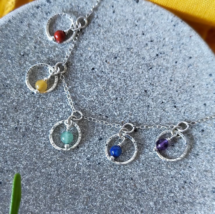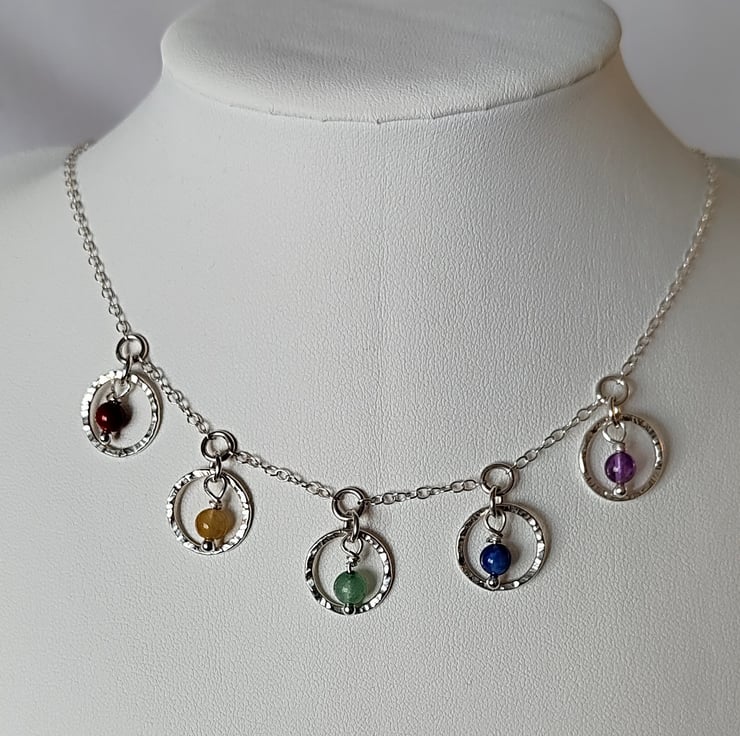 This sterling silver hammered circles necklace choker is a real eye-catching piece, the natural gemstone beads in a rainbow layout add a splash of bright colour, giving a symbol of hope. These gemstones are Red Jasper, Yellow Jade, Green Aventurine, Lapis Lazuli and Amethyst. Each bead hangs loosely inside a silver circle, I make each one individually and the natural bark effect texture is added to the silver by using a riveting hammer, making every one unique and when polished these really do sparkle as they catch the light.