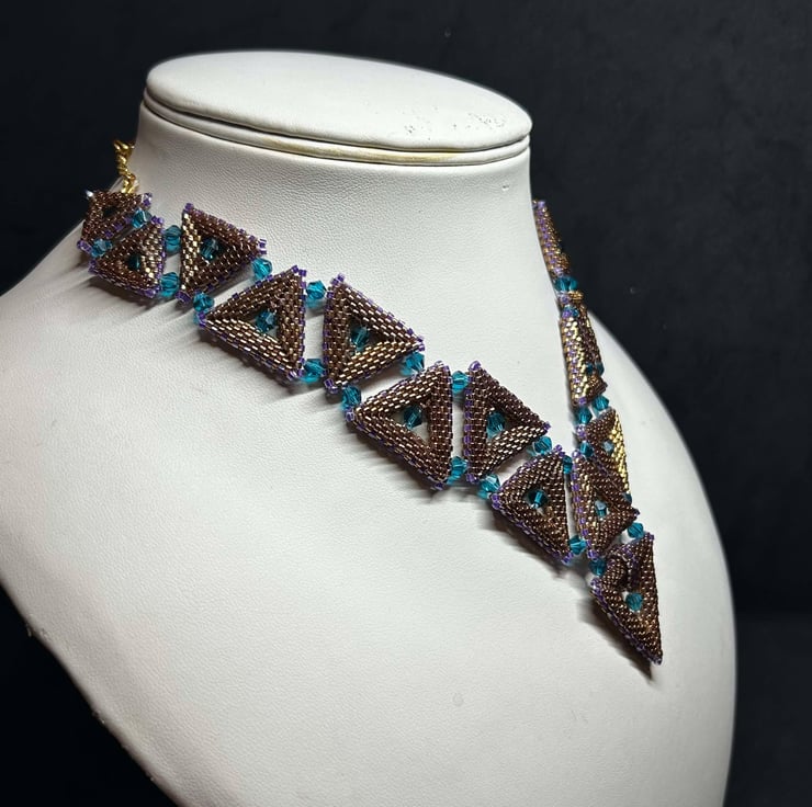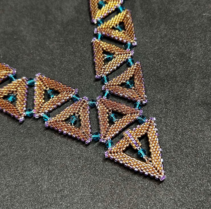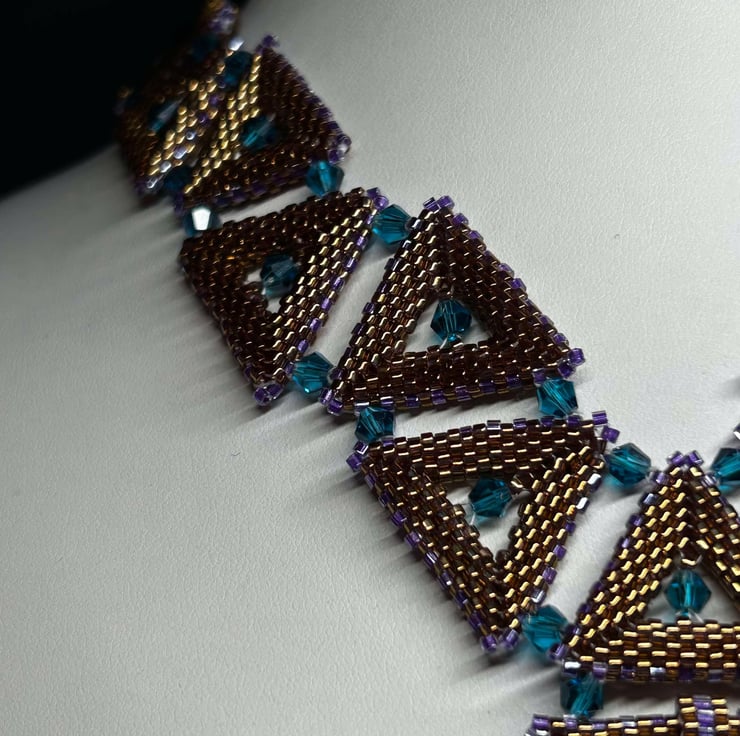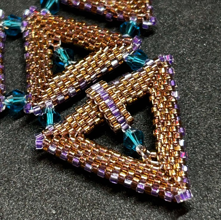 I used Miyuki Bronze glass Delica beads to form each triangle and Lilac Delica beads to add a point of difference. Each triangle features the most stunning Teal crystals, which I also used to connect the segments together.