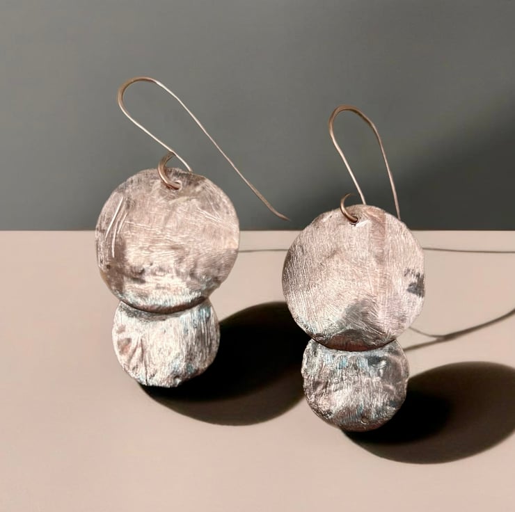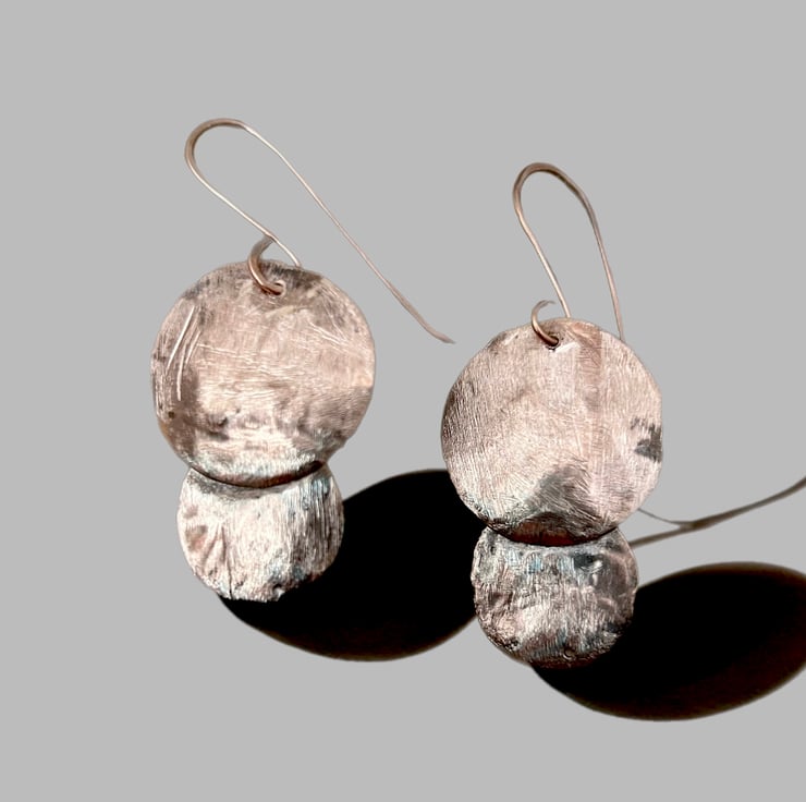 These beautiful earrings are vibrant, extremely eye catching unique and stylish. I have oxidised these earrings which is a process involving dipping the copper in liver of sulphur, once I get the desired oxidisation I remove from the solution and then the earrings are thoroughly washed To stop any further oxidisation. I then use wire wool to remove the heavier oxidisation and once happy I finish the process by spending time to polish and highlight the beautiful colour the oxidisation has achieved. I have also domed these earrings giving them a stylish look, I really love them, hope you do too. . Drop is approx 1”.